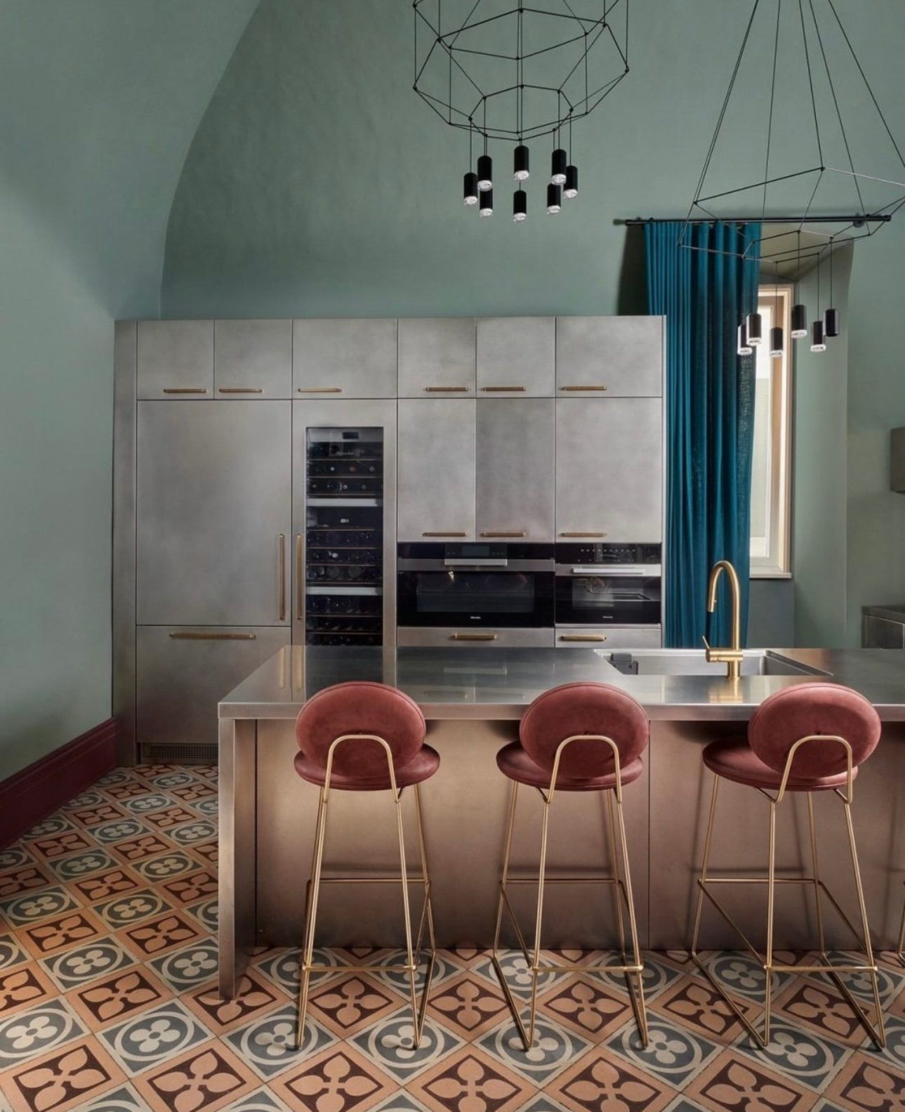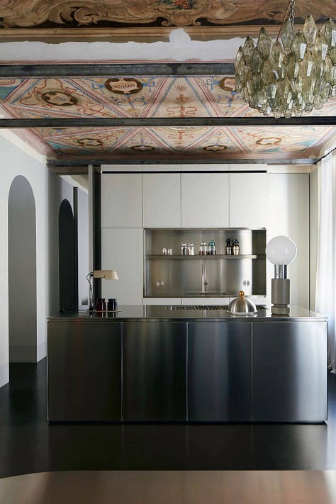 جزيرة مطبخه المصنوعة من الستانلس ستيل بلمسة “سكوتش برايت” تدخل في حوار بصري مذهل مع الجداريات السقفية التي تعود إلى قرن مضى، ومع الأسطح المعاصرة الأنيقة