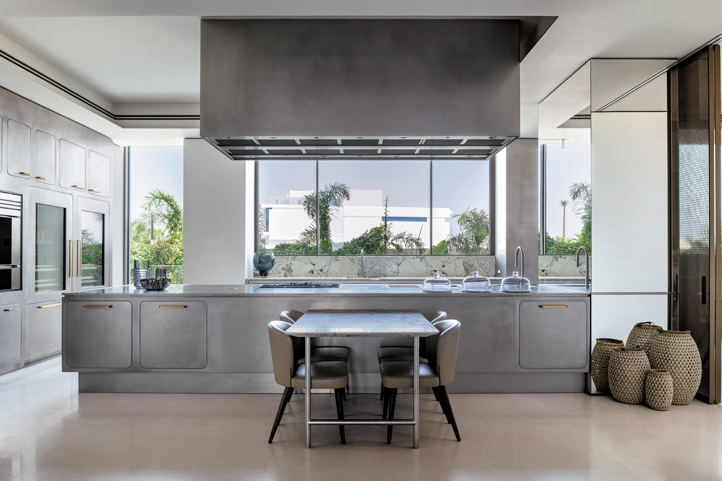 تخيلوا جزيرة مطبخ متصلة بلا فواصل، مثل مكعب معدني سحابي، تحتوي داخل شكلها النقي على كل شيء، من التخزين إلى أسطح الطهي